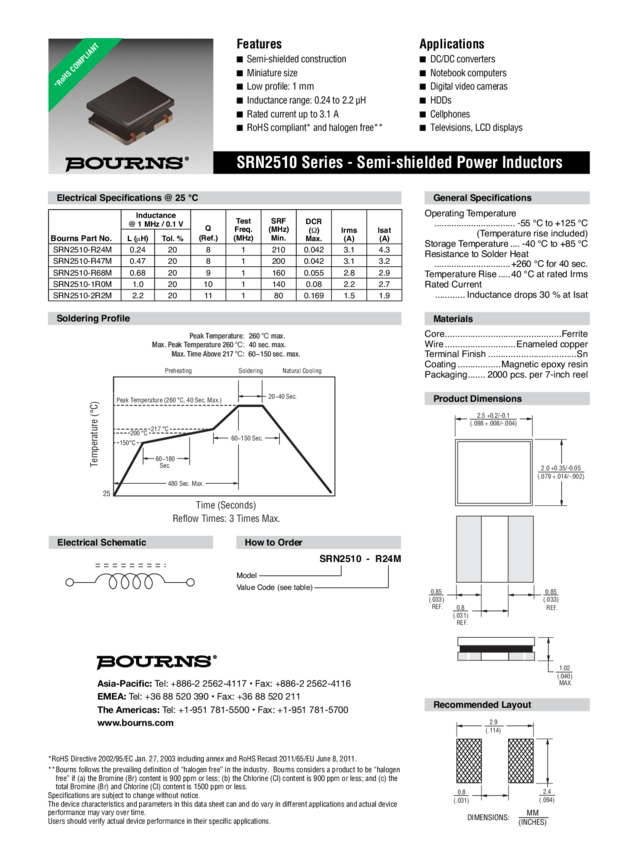 SRN2510-2R2M Ind Power Semi-Shielded Wirewound 2.2uH 20% 1MHz Ferrite 1.5A 2510 T/R