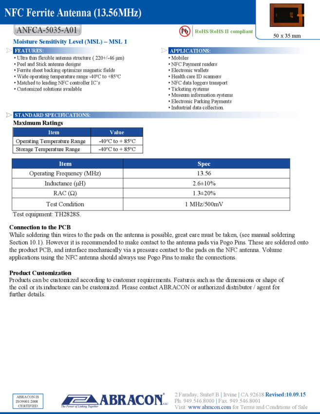 ANFCA-5035-A01 Antenna NFC Ferrite Antenna 13.56MHz SMD Box