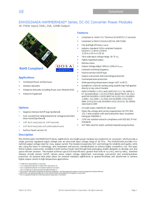 EHHD024A0A41-HZ Module DC-DC 1-OUT 5V 24A 120W 8-Pin 1/8-Brick Tray