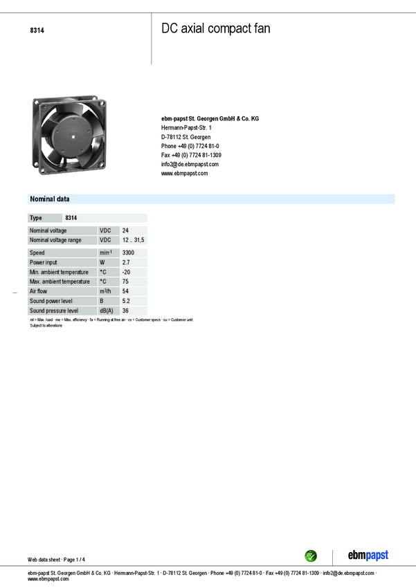 8314 DC Fan Ball Bearing 24V 2.7W 3300RPM 31.8CFM 36dB Flange Mount