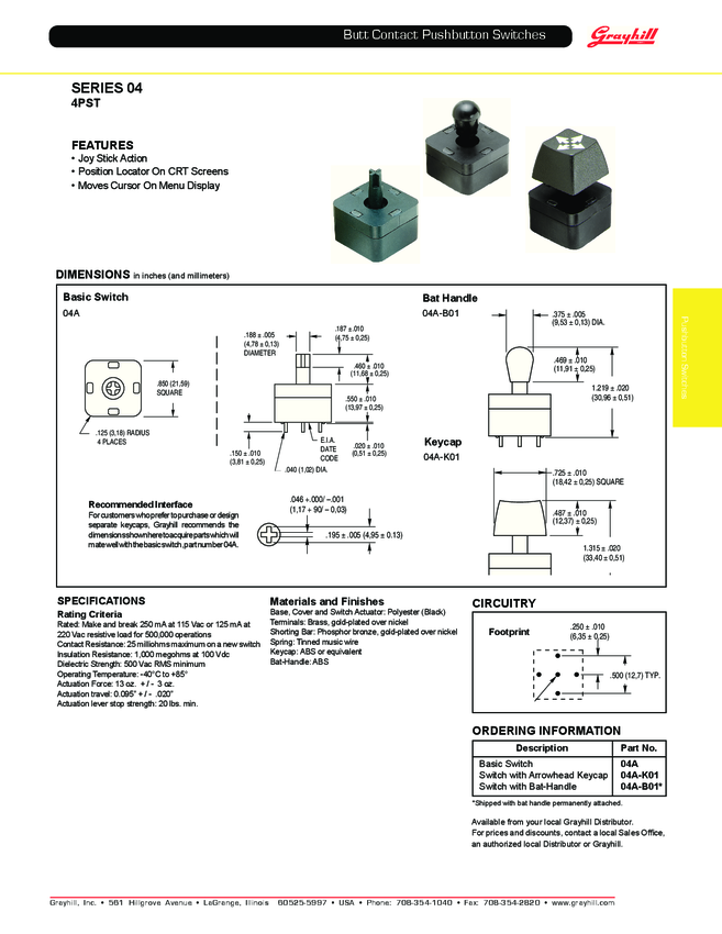 04A Switch Push Button 4PST Plunger 0.25A 220VAC PC Pins Thru-Hole