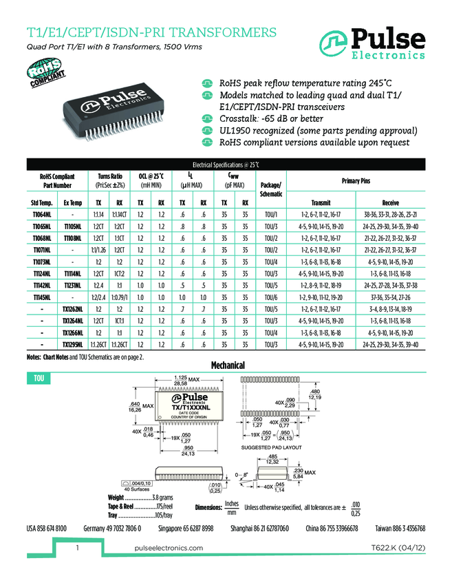 T1231NL Telecom Transformer 1:2/1:1 1500Vrms Surface Mount