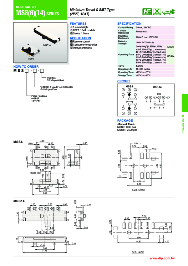 MSS14-V-T/R Switch Slide SP4T Side Slide 0.025A 24VDC 10000Cycles Gull Wing SMD T/R