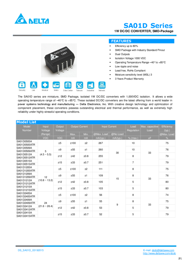 SA01D0512ATR Module DC-DC 2-OUT -12V/12V -0.042A/0.042A 1W 10-Pin SMD T/R