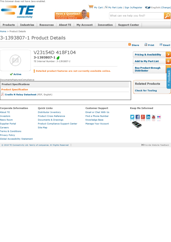 3-1393807-1 Electromechanical Relay DPDT 5A 12VDC 230Ohm Plug-In