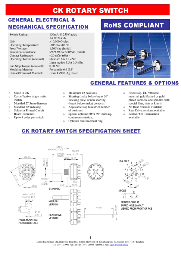 CK1051 Switch Rotary SP4T 4 Flatted Shaft PC Pins 0.15A 250VAC 250VDC