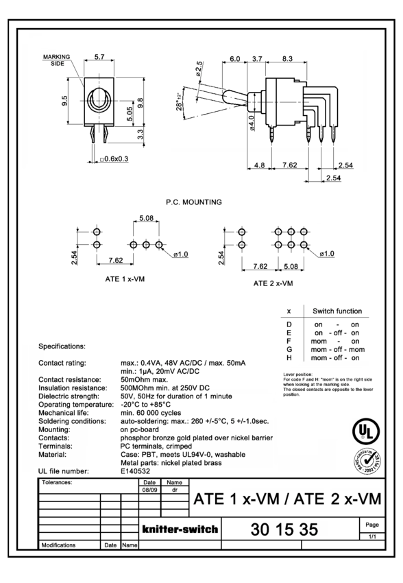 ATE2D-VM Switch Toggle ON ON DPDT Round Toggle PC Pins 0.05A 48VAC 48VDC 0.4VA PC Mo...