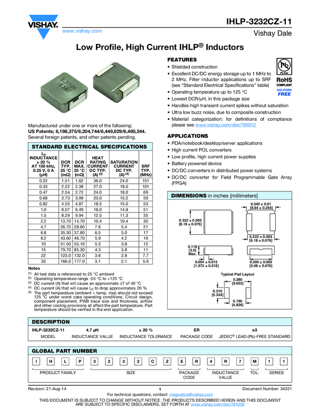 IHLP3232CZER1R5M11, IHLP3232CZERR47M11, IHLP3232CZERR82M11, IHLP3232CZER1R0M11, IHLP3232CZER4R7M11, IHLP3232CZER150M11, IHLP3232CZER220M11