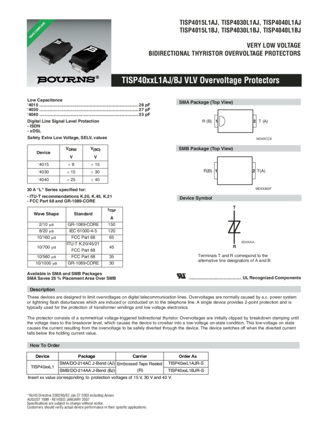 TISP4040L1AJR-S, TISP4015L1BJR-S, TISP4030L1AJR-S, TISP4015L1AJR-S