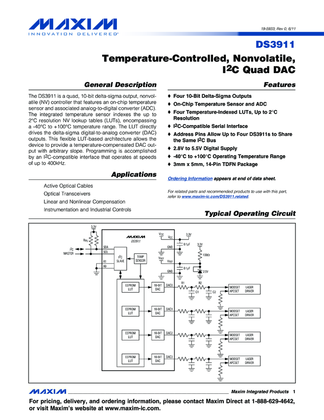 DS3911 Temperature-Controlled, Nonvolatile, I²C Quad DAC