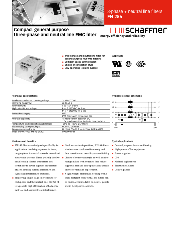 FN256-160-40 Power Line Filter 0Hz to 60Hz 160A 480VAC Threaded Stud Flange Mount