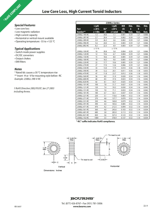 2300LL-470V-RC Ind High Current Toroid 47uH 15% 1KHz 11.8A RDL