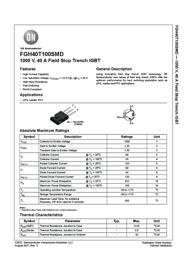 FGH40T100SMD 1000V, 40A, Field Stop Trench IGBT