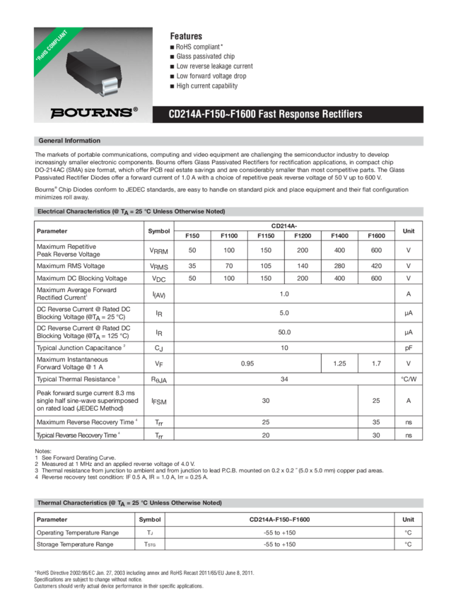 CD214A-F1600 Diode Switching 400V 1A 2-Pin SMA T/R