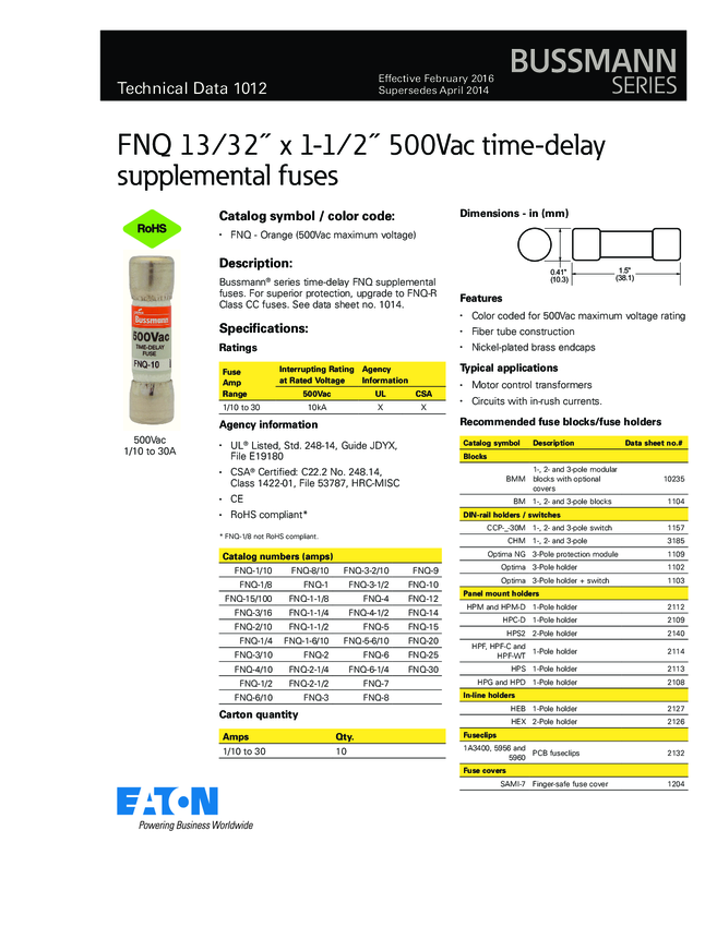 FNQ-1 6/10 Fuse Midget 1.6A 500V Slow Blow 2-Pin Cartridge Holder Carton