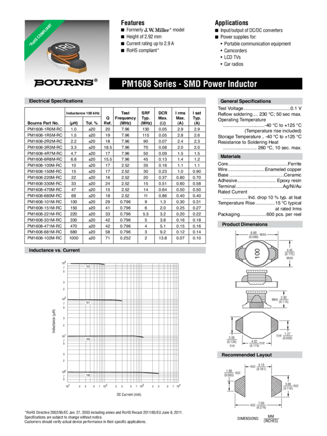 PM1608-4R7M-RC Ind Power Bobbin Core 4.7uH 20% 100KHz 17Q-Factor Ferrite 1.5A T/R