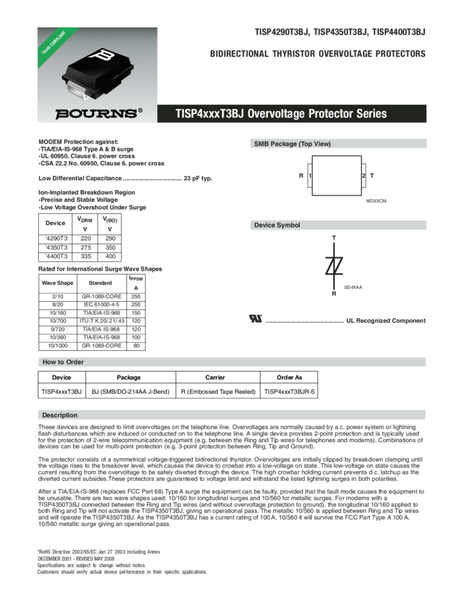 TISP4290T3BJR-S Thyristor TSPD 220V 30A 2-Pin SMB T/R