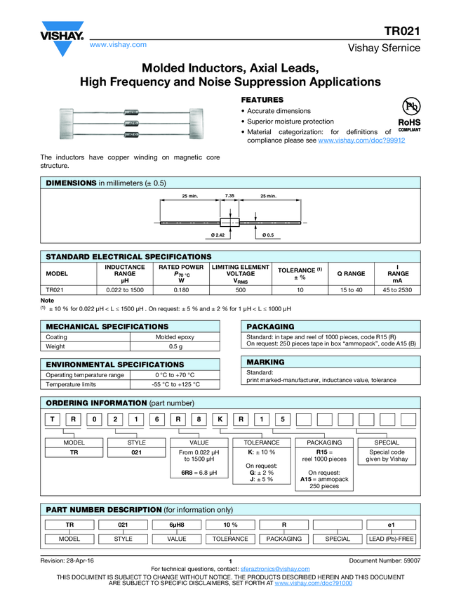 TR021-47UH-10 Ind High Frequency Molded 47uH 10% 2.5MHz 50Q-Factor 190mA AXL