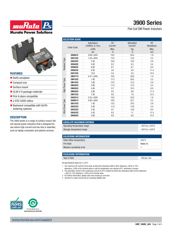 39H102C Ind Power Wirewound 8.2uH 20% 100KHz 5.8A T/R