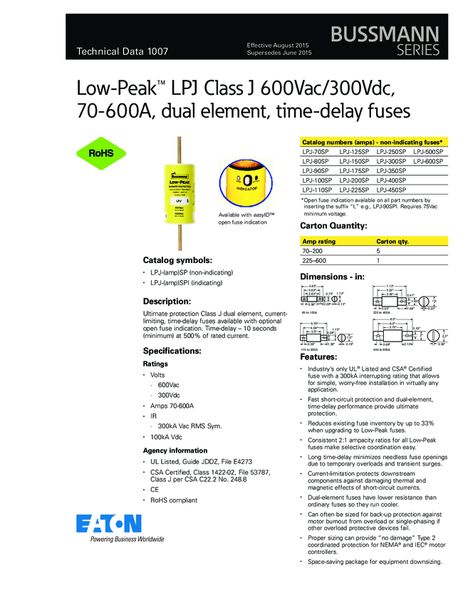 LPJ-150SPI Fuse Class J 150A 600V Slow Blow 2-Pin Flat Bolt Carton