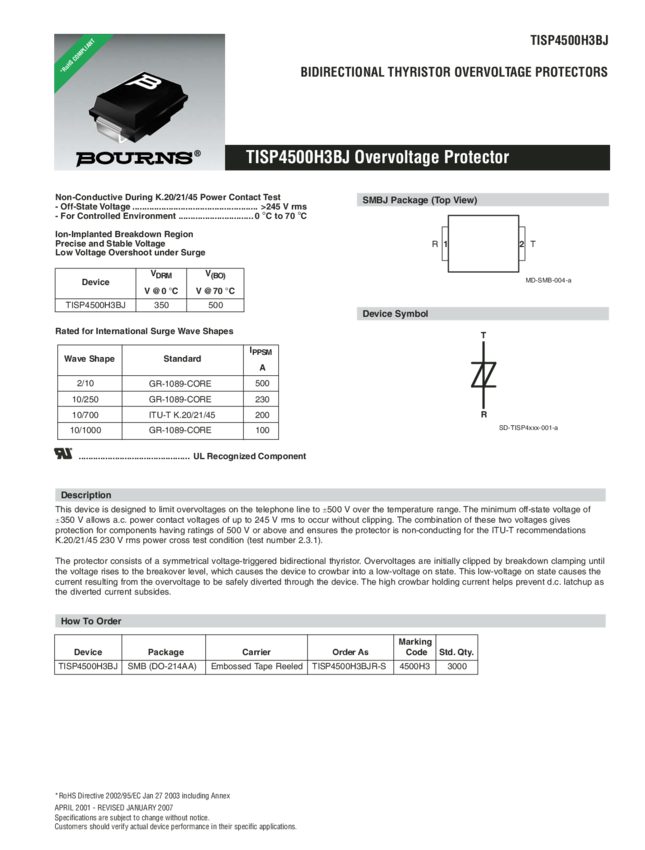TISP4500H3BJR-S Thyristor TSPD 350V 55A 2-Pin SMB T/R