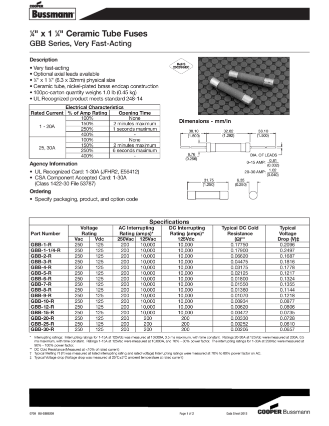 GBB-6R Fuse Miniature 6A 250V Very Fast 2-Pin Cartridge Holder