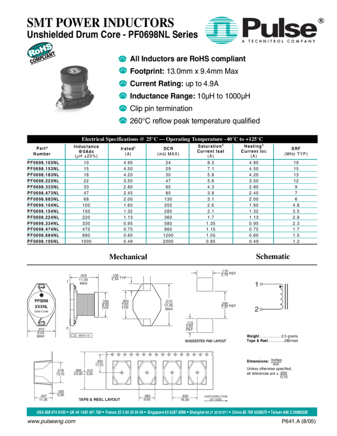 PF0698.104NLT Ind Power Unshielded Wirewound 100uH 20% 1.6A T/R