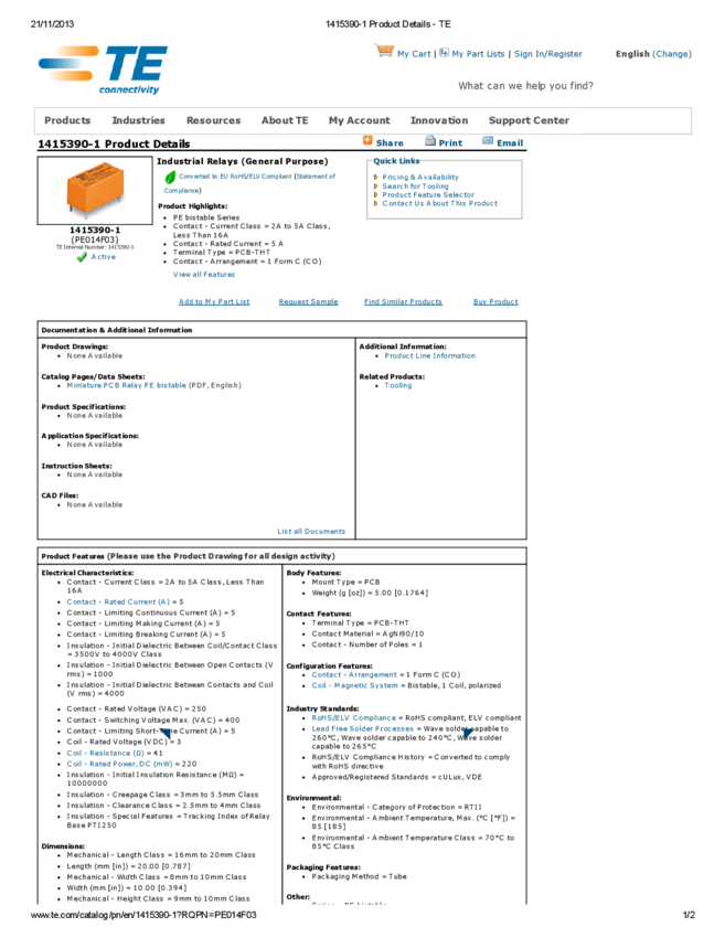 1415390-1 Electromechanical Relay SPDT 5A 3VDC 41Ohm Through Hole
