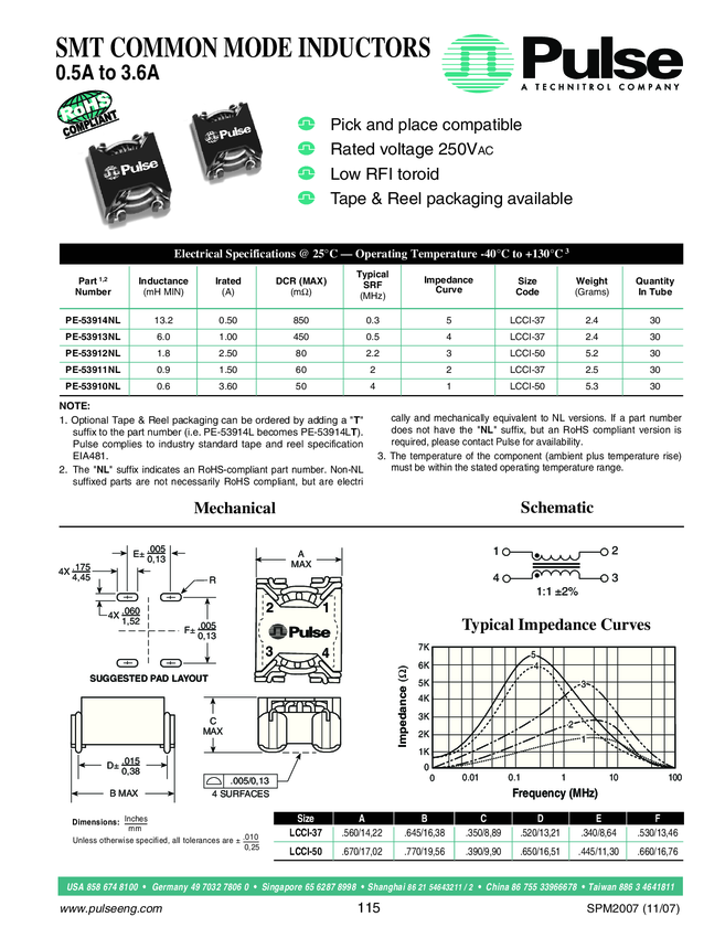 PE-53912NL Ind Common Mode Wirewound 1.8mH 2.5A Tube