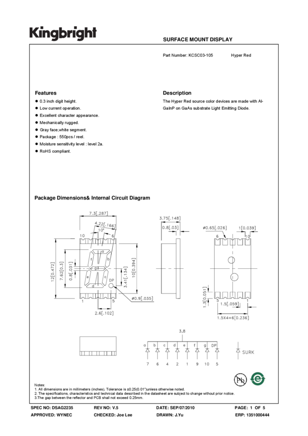 KCSC03-105 Displays Segmented Panel 1DIGIT 8LED Red 10-Pin SMD T/R