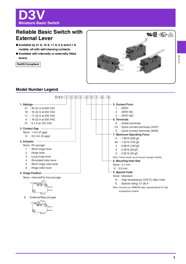 D3V-166-1A5 Switch Snap Action N.C. SPST Simulated Roller Lever Solder 16A 250VAC 250VD...