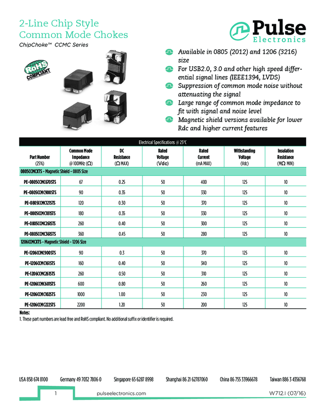 PE-0805CCMC261STS Ind Common Mode Choke Shielded Wirewound 260Ohm 25% 100MHz 300mA 0805 T/R