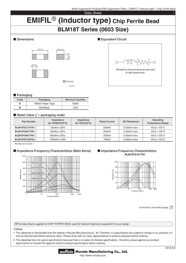 BLM18TG102TN1D Ind Chip Bead 1KOhm 25% 100MHz Ferrite 100mA 0603 Paper T/R