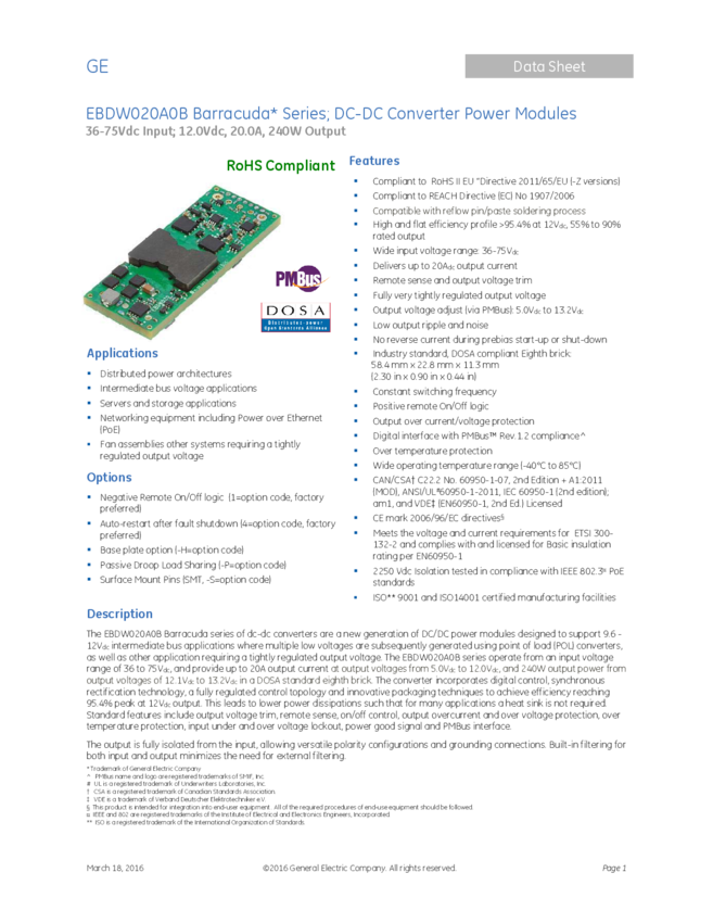 EBDW020A0B41Z Module DC-DC 1-OUT 12V 20A 240W 15-Pin Eight-Brick Tray