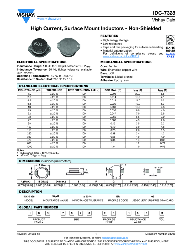 IDC7328ER220M Ind High Current Wirewound 22uH 20% 100KHz Ferrite 3.5A T/R