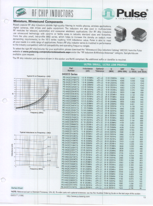 PE-0402CD330JTG Ind RF Chip Wirewound 33nH 5% 250MHz 24Q-Factor Ceramic 350mA 0402 T/R