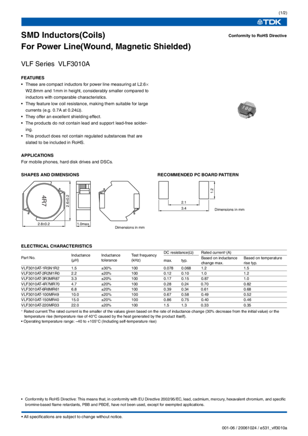 VLF3010AT-150MR40, VLF3010AT-1R5N1R2, VLF3010AT-3R3MR87, VLF3010AT-4R7MR70, VLF3010AT-220MR33, VLF3010AT-6R8MR61