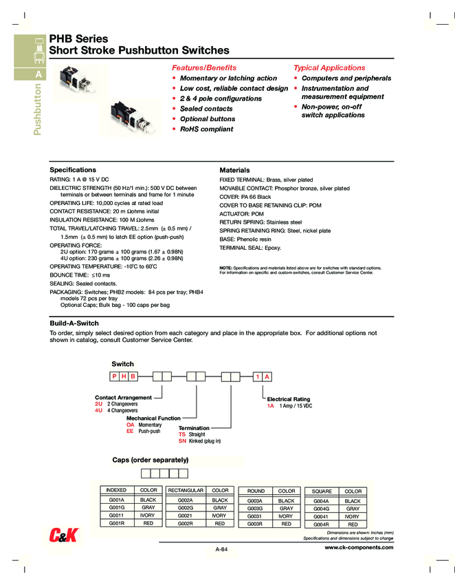PHB2UOATS1A Push Button Switch N.O./N.C. DPDT Square Plunger 1A 15VDC Push-Push PC Pins...