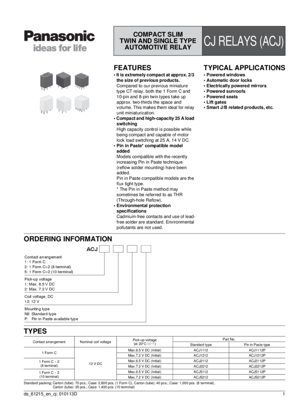 ACJ2212J Electromechanical Relay SPDT/SPDT 20/10A 12VDC 225Ohm Through Hole