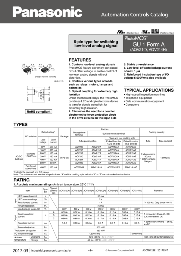 AQV214AJ CONTROLS LOW-LEVEL INPUT SIGNALS. CONTROLS LOAD VOLTAGE 60V TO 600V.