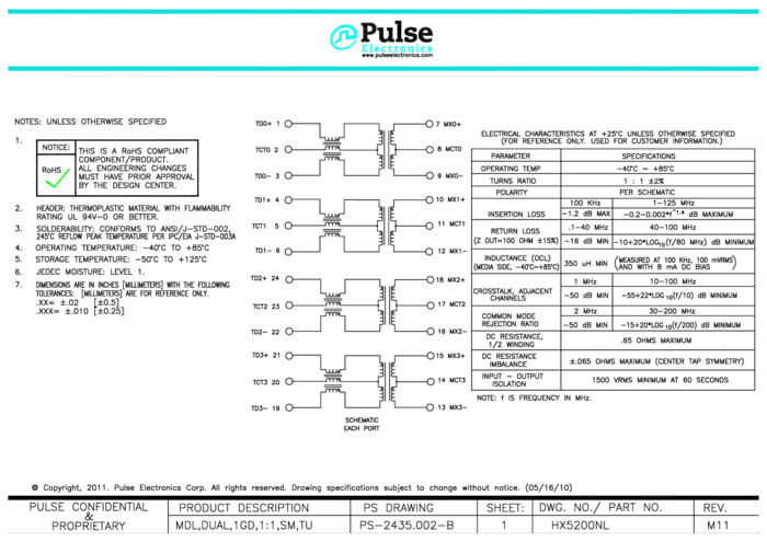 HX5200NL Telecom Transformer 1500Vrms 1dB Surface Mount