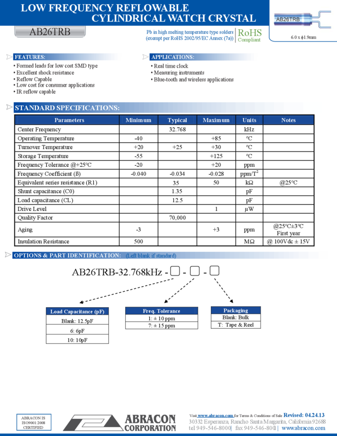 AB26TRB-32.768KHZ-T Crystal 0.032768MHz 12.5pF 2-Pin T/R
