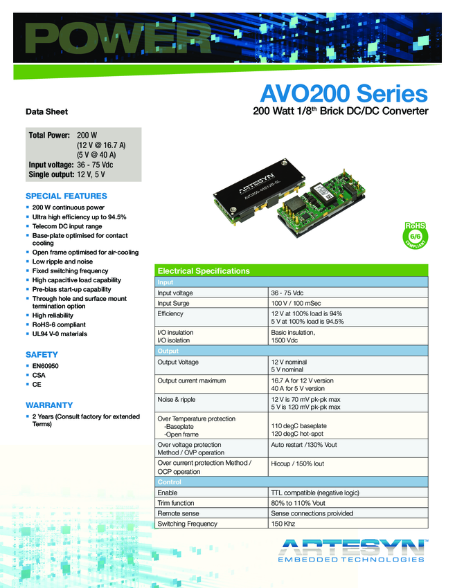 AVO200-48S05B-6L Module DC-DC 1-OUT 5V 40A 200W 8-Pin 1/8-Brick