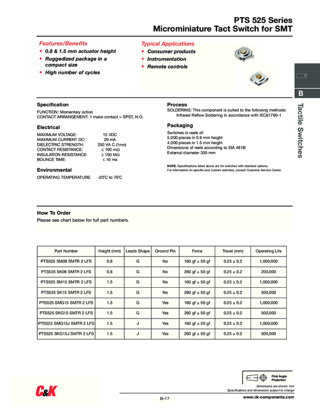 PTS525 SK15 SMTR2 LFS Switch Tactile N.O. SPST Round Button Gull Wing 0.02A 15VDC 500000Cycles 2....