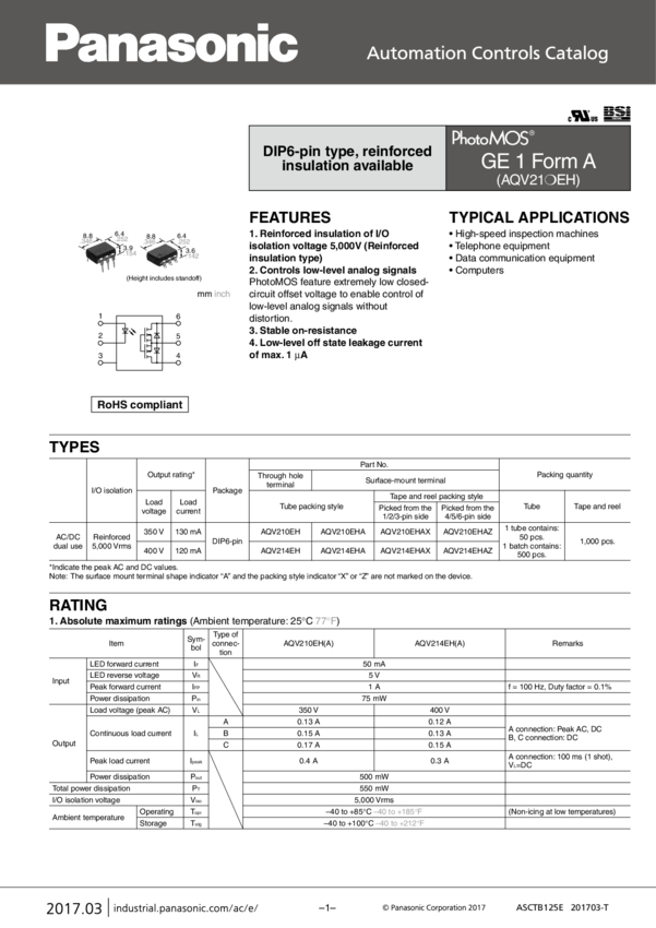 AQV210EHAJ Relay SSR 50mA 1.5V DC-IN 0.15A 400V AC/DC-OUT 6-Pin PDIP SMD Tube