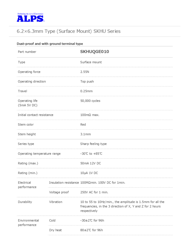 SKHUQGE010 Switch Tactile N.O. SPST Round Button J-Bend 0.05A 12VDC 2.55N SMD Embossed...