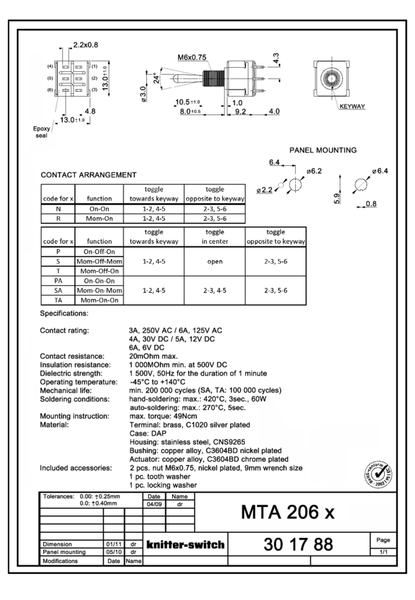 MTA206T Switch Toggle Mom OFF Mom DPDT Round Lever Solder Tag 6A 250VAC 30VDC Panel...