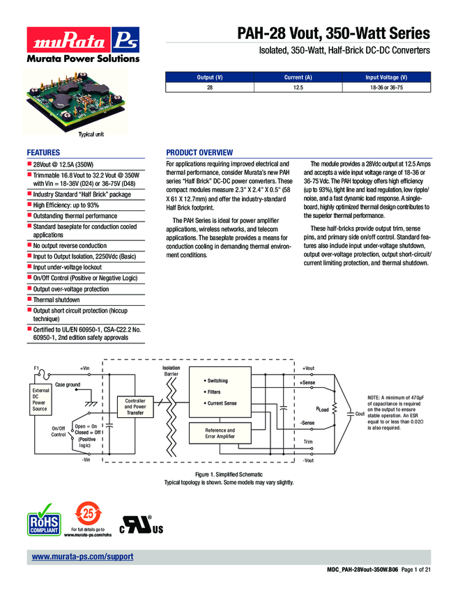 PAH-28/12.5-D24NB-C Module DC-DC 1-OUT 28V 12.5A 350W 9-Pin Half-Brick Tray
