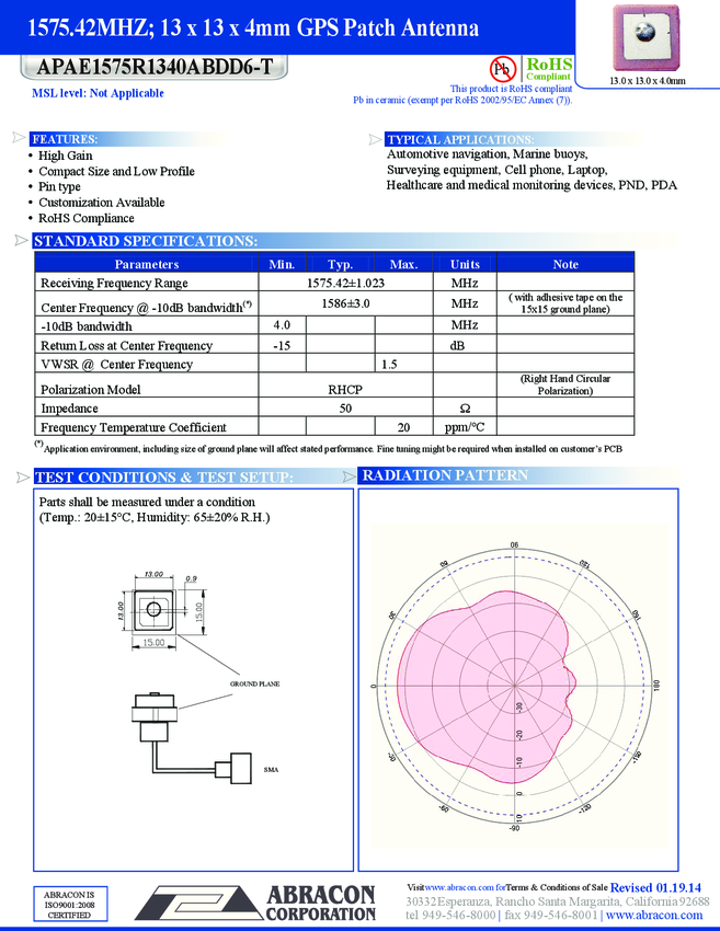 APAE1575R1340ABDD6-T Antenna Patch 0.6dBi Gain 1575.42MHz SMD Box