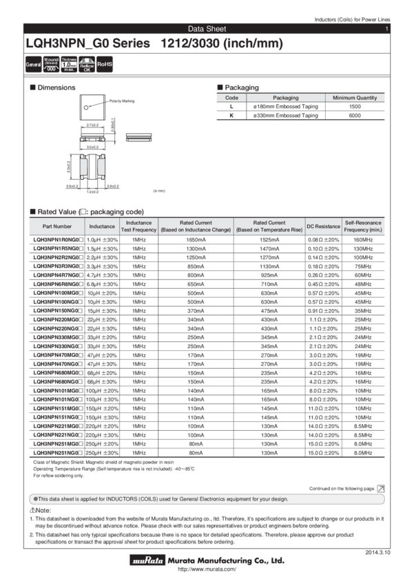 LQH3NPN100MG0L Ind Power Chip Shielded Wirewound 10uH 20% 1MHz Ferrite 630mA 1212 Embossed...